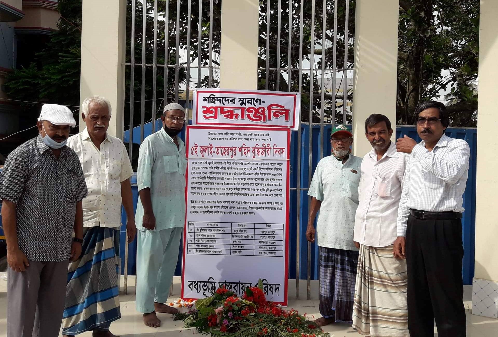 আজ মঙ্গলবার ৫ জুলাই, ২০২২ – সকাল ৮.৩০ মিনিটে ‘তাহেরপুর শহিদ পরিবার’ ও ‘বধ্যভূমি বাস্তবায়ন পরিষদ’-এর যৌথ উদ্যোগে “৫ জুলাই – তাহেরপুর শহিদ বুদ্ধিজীবী দিবস পালিত হয়েছে। তাহেরপুর কেন্দ্রীয় শহীদ মিনার প্রাঙ্গণে শহিদদের স্মৃতির উদ্দেশ্যে পুষ্পস্তবক অর্পণ ও এক মিনিট নিরবতা ম করা হয় এবং পরবর্তীতে একটি সংক্ষিপ্ত স্মৃতিচারণমূলক আলোচনা অনুষ্ঠান অনুষ্ঠিত হয় ।