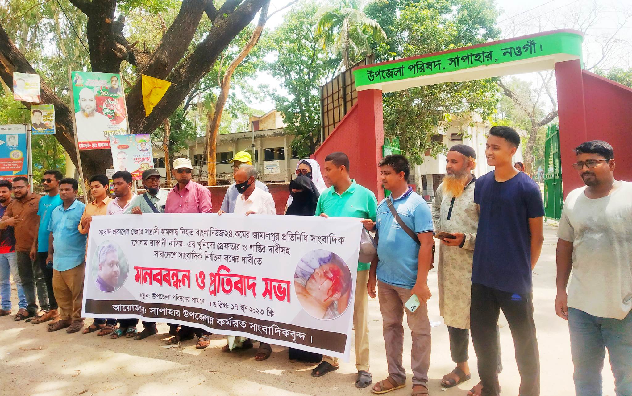 শনিবার বেলা ১১টায় উপজেলায় কর্মরত সাংবাদিকদের আয়োজনে উপজেলা পরিষদের সামনে ঘন্টাকাল ব্যাপী মানববন্ধন ও প্রতিবাদ সভা অনুষ্ঠিত হয়। উক্ত মানববন্ধন ও প্রতিবাদ সভায় বক্তব্য রাখেন সাপাহার প্রেসক্লাবের সভাপতি জাহাঙ্গীর আলম মানিক, সহ সভাপতি হাফিজুল হক, সাধারণ সম্পাদক আ. রহিম, মডেল প্রেসক্লাবের সভাপতি মনিরুল ইসলাম, সাধারণ সম্পাদক আবু বক্কার। এসময় বক্তারা বলেন “ সারাদেশে সাংবাদিক নির্যাতন একটি সচরাচর প্রথা হয়ে দাঁড়িয়েছে। সাংবাদিকরা যখন সত্যটা তুলে ধরছে তখনই হামলা-মামলার শিকার হচ্ছে।