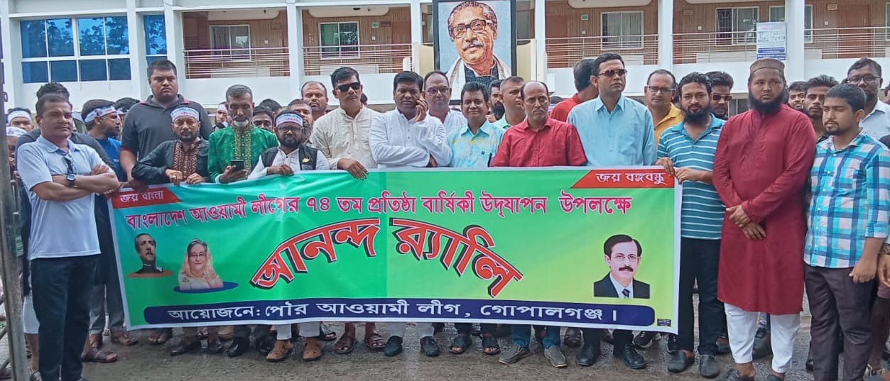 বাংলাদেশ আওয়ামীলীগ এর ৭৪ তম প্রতিষ্ঠা বার্ষিকী উপলক্ষে গোপালগঞ্জ পৌর আওয়ামীলীগের আনন্দ র্যালী উদযাপন। গোপালগঞ্জ পৌর আওয়ামীলীগের সাধারন সম্পাদক মোঃ আলিমুজ্জামান বিটুর নেতৃত্বে গোপলগঞ্জ পৌর সভা থেকে আনন্দ র্যালিটি বের হয়ে গোপালগঞ্জ শহরের সকল সড়ক প্রদক্ষিন করে গোপালগঞ্জ ব্যাংকপাড়া বদর সড়ক জেলা আওয়ামীলী এর প্রধান কার্যালয়ে এসে র্যালিটি সমাপ্ত করেন।