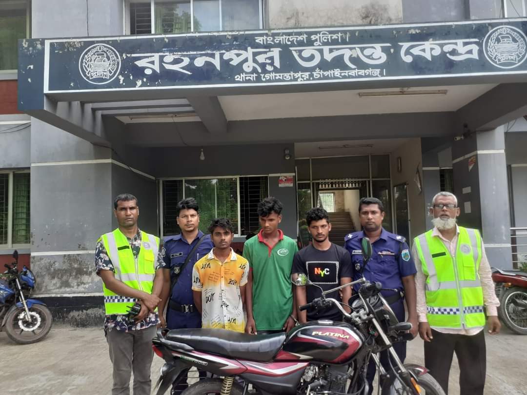 শনিবার (১৫ জুলাই) দুপুরে উপজেলার বোলিয়া ইউনিয়নের আলমপুর চাঁপাই এগ্রো প্রোডাক্ট মার্কেটিং কোম্পানি লিমিটেড কারখানার পার্শে আমবাগানে অভিযান চালিয়ে মটরসাইকেলসহ তিনজনকে আটক করে গোমস্তাপুর থানা পুলিশ। আটককৃতরা হলেন, রহনপুর পৌর এলাকার নুনগোলা গ্রামের মাহিদুল ইসলামের ছেলে মোরসালিন (মুসা) (১৬), একই গ্রামের আনিসুজ্জামান পিন্টুর ছেলে সাগর আহম্মেদ (১৯) ও স্টেশন কেডিসি পাড়ার জামিরুল ইসলামের ছেলে জনি (২০)।