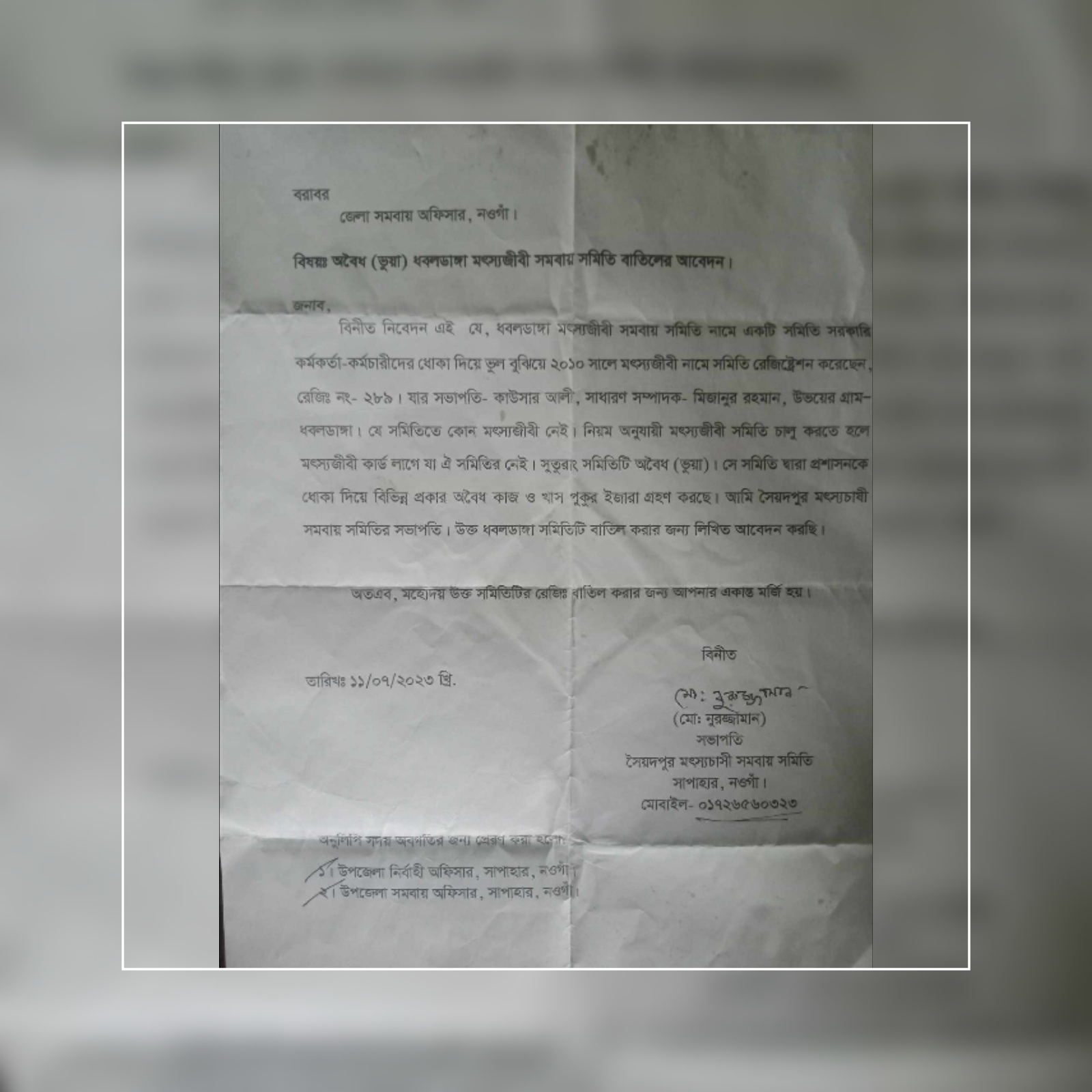 অভিযোগের প্রেক্ষিতে জানা যায়, উপজেলার " ধবলডাঙা মৎস্যজীবী সমবায় সমিতি"র সদস্যরা সরকারী কর্মকর্তা কর্মচারীদের ভুল বুঝিয়ে ২০১০ সালে উক্ত নামে রেজিষ্ট্রেশন করেন। যার রেজিষ্ট্রেশন নং-২৮৯। উক্ত সমিতির সভাপতি ধবলডাঙা গ্রামের কাউসার ও সাধারণ সম্পাদক একই গ্রামের মিজানুর রহমান। অভিযোগে আরো বলা হয়, "ধবলডাঙা মৎস্যজীবী সমবায় সমিতি" তে কোন মৎস্যজীবী নেই।
