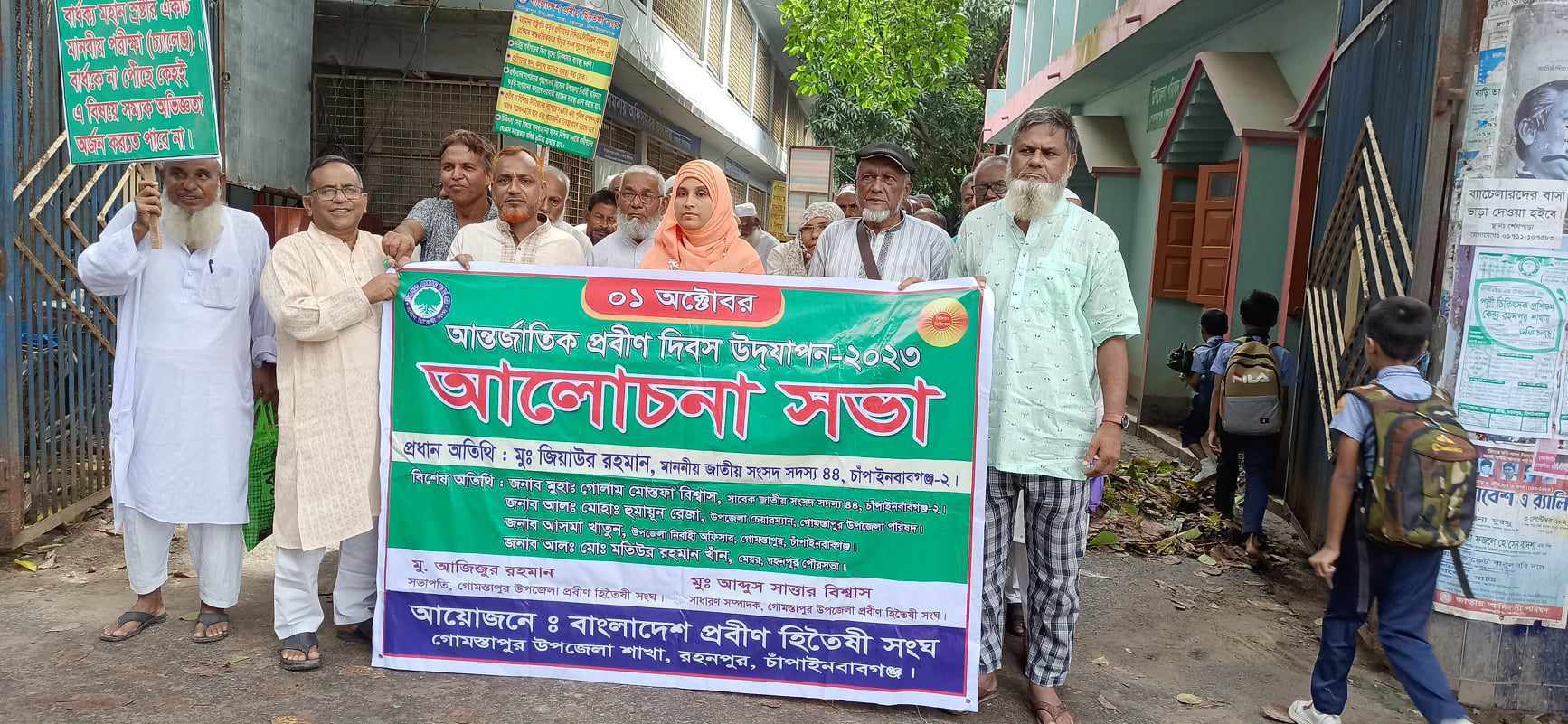 শোভাযাত্রায় উপস্থিত ছিলেন উপজেলা নির্বাহী অফিসার আসমা খাতুন। রহনপুর আহমদী বেগম সরকারি উচ্চ বিদ্যালয় মিলনায়তনে অনুষ্ঠিত আলোচনা সভা প্রবীণ হিতৈষী সংঘের গোমস্তাপুর উপজেলা সভাপতি অবসরপ্রাপ্ত অধ্যক্ষ আজিজুর রহমানের সভাপতিত্বে অনুষ্ঠিত হয়। সঞ্চালন ছিলেন সাংগঠনিক সম্পাদক অবসরপ্রাপ্ত শিক্ষক আব্দুল কাইউম।