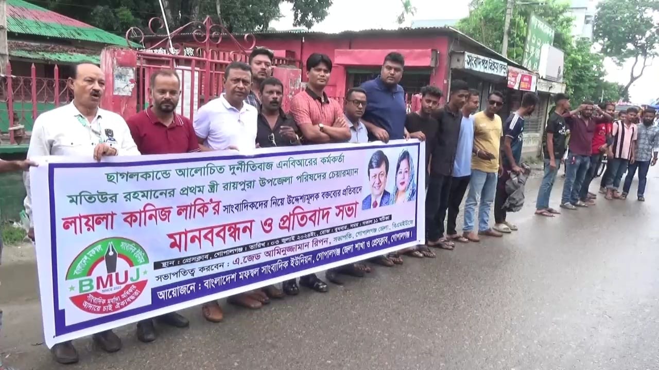 ছাগল–কাণ্ডে আলোচিত এনবিআরের কর্মকর্তা মতিউর রহমানের প্রথম স্ত্রী সাংবাদিকদের নিয়ে দেওয়া বক্তব্য ‘উদ্দেশ্যমূলক’ বলে মনে করে বাংলাদেশ মফস্বল সাংবাদিক ইউনিয়ন (বিএমউজে) গোপালগঞ্জ জেলা শাখা ও প্রেসক্লাব গোপালগঞ্জ। লায়লা কানিজ নরসিংদীর রায়পুরা উপজেলা পরিষদের চেয়ারম্যান। একজন জনপ্রতিনিধি হয়ে লায়লা কানিজ সাংবাদিকদের নিয়ে এ ধরনের ঔদ্ধত্যমূলক বক্তব্য দেওয়া অন্যায়। রোববার এক বিবৃতিতে বিএমইউজে কেন্দ্রীয় সভাপতি সোহেল আহমেদ ও সাধারণ সম্পাদক শিবলী সাদিক খাঁন এ কথা বলেন। বিএমইউজে’র বিবৃতিতে বলা হয়েছে, গত বৃহস্পতিবার লায়লা কানিজ সাংবাদিকদের সম্পর্কে কুরুচিপূর্ণ ও হীন উদ্দেশ্যমূলক মন্তব্য করেছেন। তিনি বলেছেন, ‘বড় বড় সাংবাদিককে কিনেই তারপর এসেছি সব থেমে যাবে।’ তাঁর এমন বক্তব্য সাংবাদিক সমাজকে মর্মাহত করেছে। আগামী ২৪ ঘণ্টার মধ্যে এ ধরনের উদ্দেশ্যমূলক বক্তব্য প্রত্যাহার করে তাঁকে নিঃশর্ত ক্ষমা চাইতে হবে অন্যথায় আগামী ৩ জুলাই ১১ টায় বিএমইউজে এর কেন্দ্রীয় কমিটি ও ঢাকা মহানগর দক্ষিণ বিএমইউজের উদ্যোগে সারা দেশে প্রতিবাদ সভা ও মানববন্ধন এর ঘোষণা দেয়া হয়। মানববন্ধন উপজেলা চেয়ারম্যান লায়লা কানিজ লাকীর বিরুদ্ধে বিএমইউজে গোপালগঞ্জ শাখা ও প্রেসক্লাব গোপালগঞ্জ সহ গোপালগঞ্জের সকল সাংবাদিক বৃন্দ ব্যবস্থা গ্রহণের জন্য সংশ্লিষ্ট কর্তৃপক্ষের দৃষ্টি আকর্ষণ করেন।