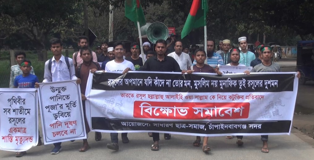 “রসুলের অপমানে যদি কাঁদে না তোর মন, মুসলিম নয় মুনাফিক তুই রসুলের দুশমন” শ্লোগাণে প্রতিবাদ, বিক্ষোভ মিছিল ও সমাবেশ অনুষ্ঠিত হয়েছে চাঁপাইনবাবগঞ্জে। পৃথিবীর সর্বকালের সর্বশ্রেষ্ঠ নবী মুসলিমদের প্রাণ প্রিয় রাসুল হযরত মুহাম্মাদ (সা.) কে নিয়ে ভারতের মহারাষ্ট্রের হিন্দু পুরোহিত রামগিরি মহারাজের করা কটুক্তি ও তাকে বিজেপির সাংসদ নিতেশ রানের সমর্থনের প্রতিবাদে চাঁপাইনবাবগঞ্জ সদর উপজেলার সাধারণ ছাত্র সমাজের ব্যানারে এই কর্মসূচী পালন করে বিভিন্ন শিক্ষা প্রতিষ্ঠানের শিক্ষার্থীরা। বুধবার (২ অক্টোবর) বেলা সাড়ে ১১টায় নবাবগঞ্জ সরকারি কলেজ ও জেলা প্রশাসকের কার্যালয়ের সামনে সমাবেশ করে প্রতিবাদ করেন শিক্ষার্থীরা।