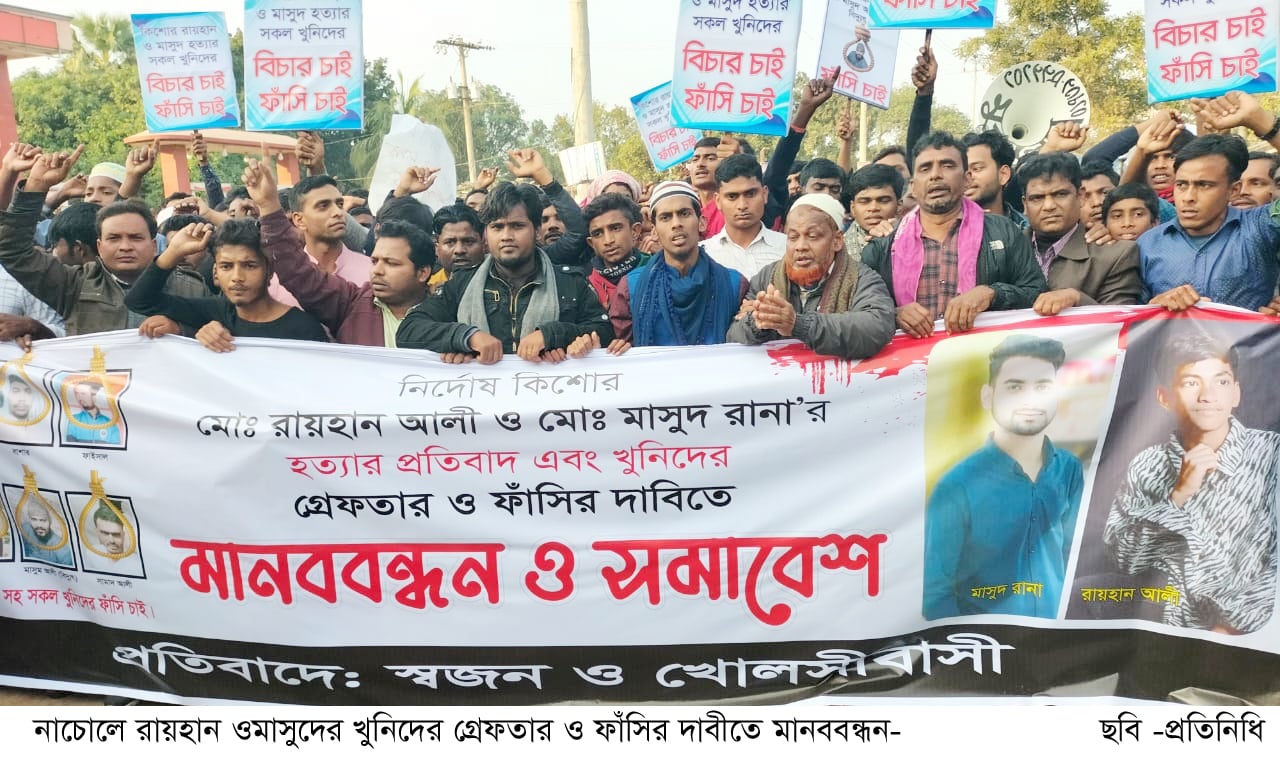 নাচোলে জোড়া খুনের ঘটনায় আসামীদের গ্রেফতারের দাবীতে মানববন্ধন