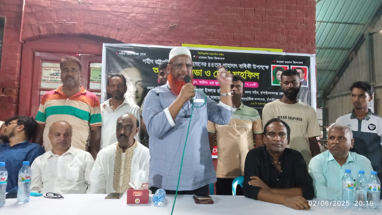 চাঁপাইনবাবগন্জের নাচোলে শহীদ প্রেসিডেন্ট জিয়াউর রহমানের ৪৪তম শাহাদাত বার্ষিকী পালন উপলক্ষে আলোচনা সভা ও দোয়া মাহফিল অনুষ্ঠিত। সোমবার বাদ মাগরিব নাচোল রেলস্টেশন প্ল্যাটফর্মে উপজেলা ও পৌর বিএনপির আয়োজনে নাচোল উপজেলা বিএনপির সাধারণ সম্পাদক আবু তাহের খোকন এর সভাপতিত্বে প্রধান অতিথির বক্তব্য রাখেন জেলা বিএনপি সদস্য সচীব আলহাজ্ব রফিকুল ইসলাম চাইনিজ। প্রধান বক্তা ছিলেন চাঁপাইনবাবগঞ্জ- আসনের মনোনায়ন প্রত্যাশী জেলা বিএনপির সাবেক সাংগঠিক সম্পাদক আব্দুস সালাম তুহিন। এছাড়া আরো উপস্থিত ছিলেন রহনপুর পৌর সভার সাবেক মেয়র ও বিএনপি নেতা তারেক রহমান, নাচোল উপজেলা বিএনপি নেতা শাজাহান আলী মেম্বার,জেলা স্বেচ্ছাসেবক দলের যুগ্ন আহবায়ক তন্ময় আহমেদ সহ বিভিন্ন ইউনিয়ন থেকে আগত বিএনপির নেতৃবৃন্দ ও অঙ্গ সহযোগী সংগঠনের নেতৃবৃন্দ। অনুষ্ঠানের প্রধান অতিথি বলেন সরকার বিগত ফ্যাসিস্ট সরকার দেশটাকে ধ্বংস পড়ে গেছে। দেশের উন্নয়নে সকলকে একযোগে কাজ করতে হবে। আওয়ামী লীগের নেতৃবৃন্দ একাধিকবার ভারতে আশ্রয় গ্রহণ করেছে এবার তাদের বিচার পরে ঘরে ওঠানো হবে। অন্তর্বর্তী সরকারের দৃষ্টি আকর্ষণ করে তিনি বলেন দ্রুত নির্বাচন দিয়ে নির্বাচিত জনগণের প্রতিনিধির হাতে ক্ষমতা হস্তান্তর করুন নইলে দেশ গভীর সংকটে পড়বে। অনুষ্ঠানের প্রধান বক্তা তুহিন বলেন, আমি আপনাদের এলাকার সন্তান আমি দীর্ঘ ২৫ বছর যাবত বিএনপির রাজনীতির সাথে সক্রিয় জড়িত রয়েছি। আমাকে দল মনোনয়ন দিলে আপনারা আমাকে ভোট দিয়ে জয়যুক্ত করবেন। আমাকে মাসে নয়,সপ্তাহে নয়, আমাকে এলাকায় প্রতিদিন পাবেন।।