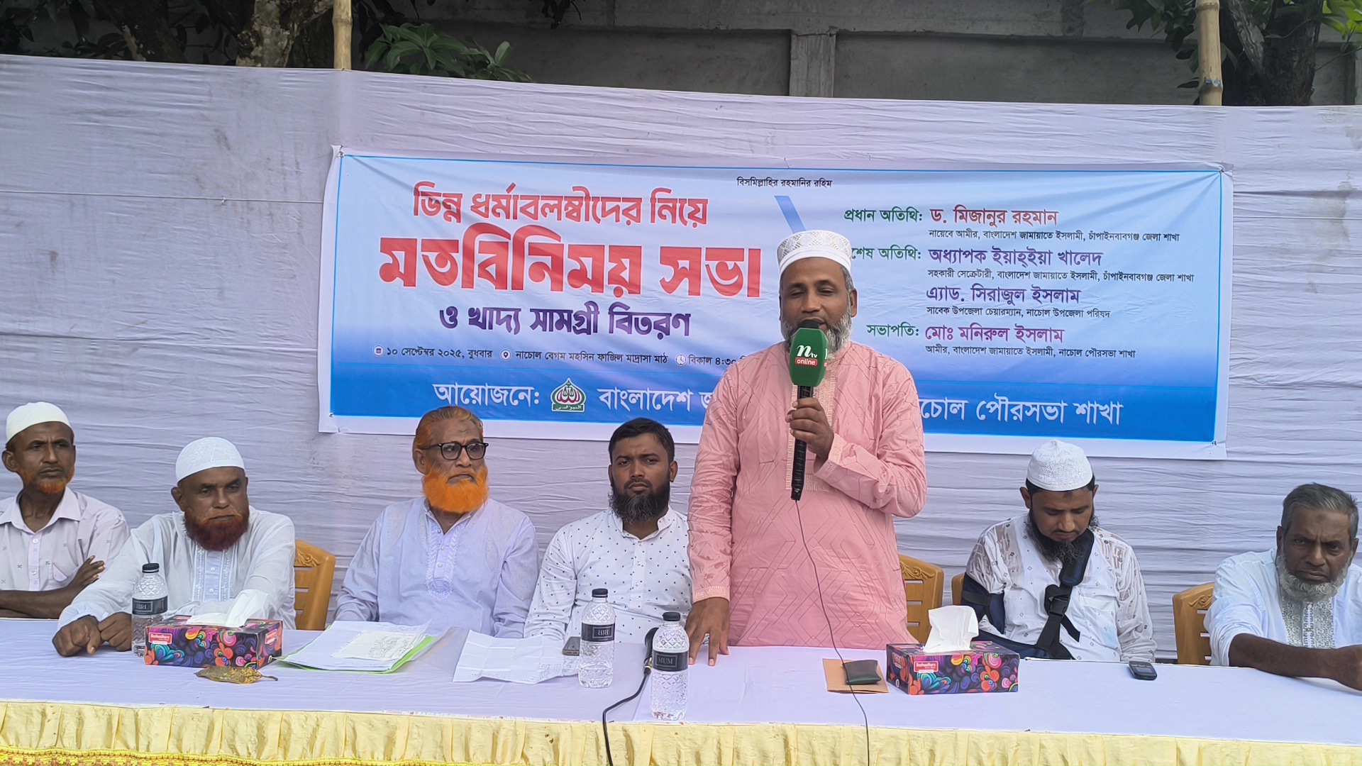 চাঁপাইনবাবগঞ্জের নাচোলে জামায়াতের মতবিনিময়সভা ও ভিন্ন ধর্মাবলম্বীদের মাঝে খাদ্যসামগ্রী বিতরণ করা হয়েছে। বুধবার বিকেল সাড়ে ৪টায় নাচোল বেগম মহসিন ফাজিল মাদ্রাসা মাঠে এক আলোচনাসভা অনুষ্ঠিত হয়। নাচোল পৌর জামায়াতের আমীর মনিরুল ইসলাম এর সভাপতিত্বে আলোচনা সভায় প্রধান অতিথির বক্তব্য রাখেন জেলা জামায়াতের নায়েবে আমির ড. মিজানুর রহমান,বিশেষ অতিথির বক্তব্য রাখেন উপজেলা পরিষদের সাবেক চেয়ারম্যান অ্যাড. সিরাজুল ইসলাম। এছাড়া অন্যান্যের মধ্যে উপস্থিত ছিলেন উপজেলা জামায়াতের আমীর ইয়াকুব আলী, নায়েবে আমীর ডাঃ রফিকুল ইসলাম, জামায়াত নেতা খলিলুর রহমান, ইসমাইল হক ও সাংবাদিক মতিউর রহমানসহ বিভিন্ন এলাকা থেকে আগত জামায়তের নেতৃবৃন্দ ও গণ্যমান্য ব্যাক্তিবর্গ । আলোচনা শেষে ১৯০জন ক্ষুদ্রনৃগোষ্ঠী ও বিভিন্ন ধর্মাম্বলীদের মাঝে খাদ্য সামগ্রী বিতরণ করা হয়।
