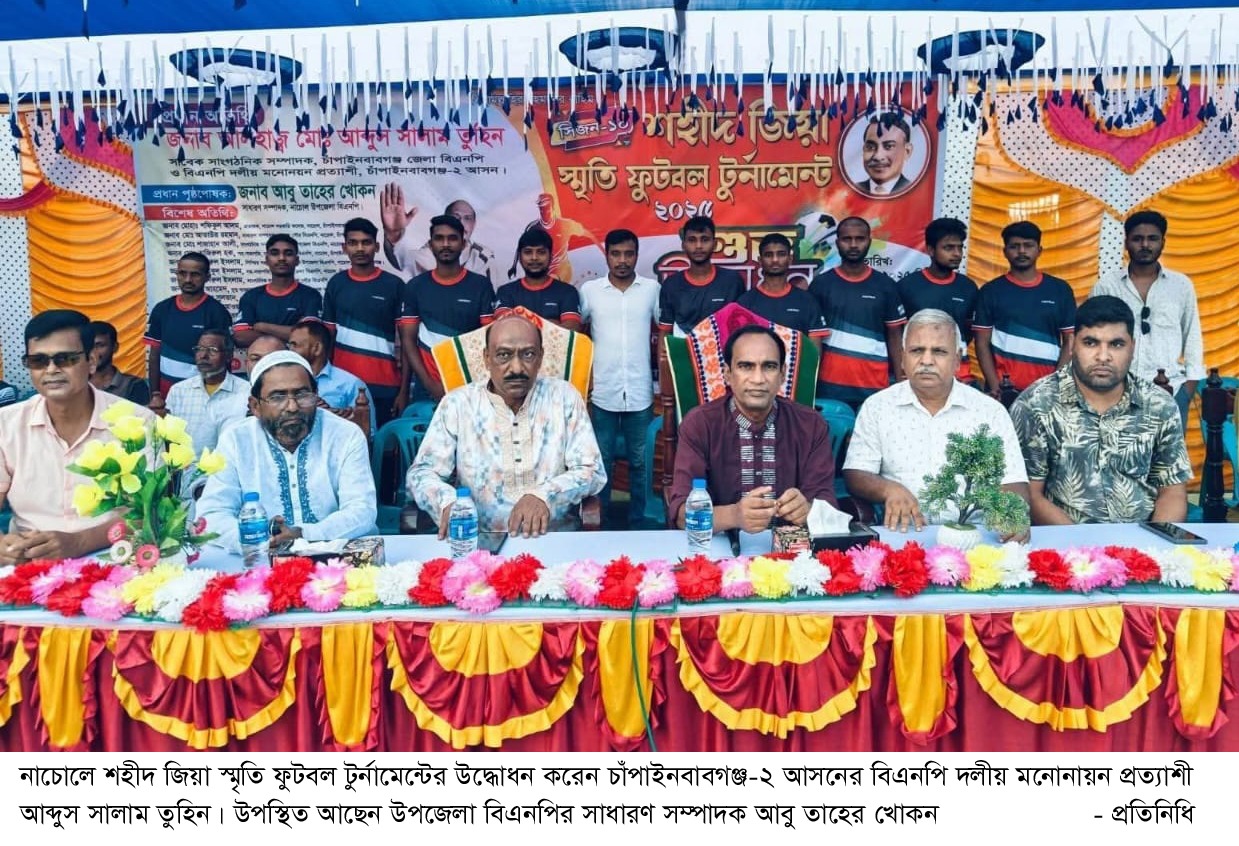 চাঁপাইনবাবগঞ্জের নাচোলে শহীদ জিয়া স্মৃতি ফুটবল টুর্নামেন্টের উদ্বোধন হয়েছে। গতকাল শুক্রবার রেলস্টেশন মাঠে জাতীয় পতাকা ও দলীয় পতাকা উত্তোলনের পর পায়রা উড়িয়ে খেলার উদ্বোধন করেন জেলা বিএনপির সাবেক সাংগঠনিক সম্পাদক ও চাঁপাইনবাবগঞ্জ-২ আসনের বিএনপি দলীয় মনোনায়ন প্রত্যাশী আলহাজ্ব আব্দুস সালাম তুহিন। এসময় উপস্থিত ছিলেন এই টুর্নামেন্টের প্রধান পৃষ্টপোষক, উপজেলা বিএনপির সাধারণ সম্পাদক ও সাবেক ভাইস চেয়ারম্যান আবু তাহের খোকন। বিশেষ অতিথি ছিলেন নাচোল সরকারী কলেজের প্রভাষক শফিকুল আলম, উপজেলা বিএনপির সহসভাপতি প্রভাষক মনিরুল ইসলাম, সহসাধারণ সম্পাদক আব্দুল আওয়াল, সাংগঠনিক সম্পাদক শাজাহান আলী মেম্বার, পৌর বিএনপির সাধারণ সম্পাদক আতাউর রহমান, জেলা স্বোচ্ছাসেবক দলের যুগ্ম আহবায়ক তন্ময় আহম্মেদ, বিএনপি নেতা রফিকুল ইসলাম, ছাত্রনেতা মো.সাকিবসহ বিভিন্ন অঙ্গসহযোগী সংগঠনের নেতৃবৃন্দ। উদ্বোধনী খেলায় নাচোল রেলস্টেশন ফুটবল দল(৩-১) গোলে ভেরেন্ডী বাজার জুনিয়র বয় ফুটবল দলকে পরাজিত করে। এই টুর্নামেন্টে ১৬টি দল অংশগ্রহন করবে বলে প্রধান পৃষ্টপোষক আবু তাহের খোকন জানান। প্রধান অতিথি আব্দুস সালাম তুহিন বলেন যুব সমাজকে মাদক মুক্ত রাখতে শিক্ষার পাশাপাশি খেলাধুলা ও বিনোদনের কোন বিকল্প নাই। আগামীর বাংলাদেশ বির্নিমানে তরুন ও যুব সমাজকে অগ্রনী ভূমিকা পালন করতে হবে।