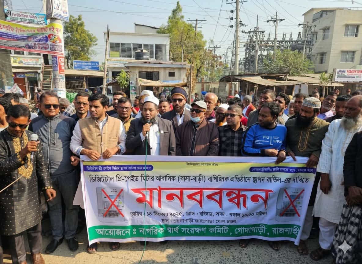 গোদাগাড়ী (রাজশাহী) প্রতিনিধি: ডিজিটাল প্রিপেইড বৈদ্যুতিক মিটার স্থাপন কার্যক্রম বন্ধের দাবিতে রাজশাহীর গোদাগাড়ীতে ব্যাপক মানববন্ধন ও বিক্ষোভ কর্মসূচি পালিত হয়েছে। সাধারণ গ্রাহকদের ভোগান্তি, অতিরিক্ত বিল এবং নীতিগত বৈষম্যের অভিযোগ তুলে ‘গোদাগাড়ী নাগরিক স্বার্থ সংরক্ষণ কমিটি’ এই কর্মসূচির আয়োজন করে।