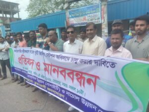 তন্ময় আহম্মেদ, এনমাসের সভাপতি সাকিল রেজা, নাচোল প্রেসক্লাবের সভাপতি অলিউল হক ডলার, নাচোল উপজেলা সাউন্ড ও ডেকোরেটর কল্যাণ সমিতির সাধারন সম্পাদক নসিব হোসেন প্রমূখ। অনুষ্ঠানটি সঞ্চালনা করেন নাচোল উপজেলা সাউন্ড ও ডেকোরেটর কল্যাণ সমিতির সাধারণ সম্পাদক হায়দার আলী। বক্তারা বলেন, নাচোল উপজেলায় জ্বালানি সংকটে নাজেহাল যানবাহন চালক ও কৃষকরা। নাচোল পৌর এলাকা নাচোল থেকে আমনুরা গামী দক্ষিণ সাকো পাড়ার মেইন রাস্তা পাশে আবস্থিত সুইটি ফিলিং স্টেশনটি পারিবারিক বিরোধের জেরে দীর্ঘদিন বন্ধ থাকায় দিশেহারা হয়ে পড়েছে নাচোল উপজেলার যানবাহন চালক ,মালিক ও কৃষকরা। ভূক্তোভূগিরা তেল সংগ্রহনের জন্য নাচোল বাসস্ট্যান্ড থেকে ১২ কিলোমিটার দক্ষিনে আমনুরা ফিলিং স্টেশন, উত্তর দিকে ১৩কিলোমিটার দুরে ধানসুরা মোড়ে এবং পশ্চিমে ১৭কিলোমিটার দুরে মল্লিকপুর বাজারে পাম্পে জ্বালানি সংগ্রহ(পেট্রেল, অকটেন, ডিজেল) করতে যেতে হয়। এতে করে সময় নষ্ট ও অর্থ অপচয় করতে হচ্ছে ভূক্তোভূগিদের। উক্ত ফিলিং স্টেশনগুলোতে থেকে জ্বালানি সংগ্রহ সম্ভব হচ্ছেনা। দীর্ঘ লাইনে তাদের ঘন্টার পর ঘন্টা অপেক্ষা করতে হচ্ছে। এই সংকটময় পরিস্থিতিতে কালোবাজারি সিন্ডিকেট অবৈধ পন্থায় তেল সংগ্রহ করে খোলা বাজারে চড়া দামে বিক্রির অভিযোগেও রয়েছে। তাই এই সংকটময় পরিস্থিতিতে দ্রুত এই পাম্পটি চালু করা প্রয়োজন। ৭দিনের আল্টিমেটাম দিয়ে পাম্পটি চালু না হলে জনগণের দূর্ভোগ লাঘবে কঠোর কর্মসূচীর হুশিয়ারী দেন। মানববন্ধন শেষে নাচোল উপজেলা নির্বাহী অফিসার ও জেলা প্রশাসন বরাবর স্মারকলিপি প্রদান করা হয়।