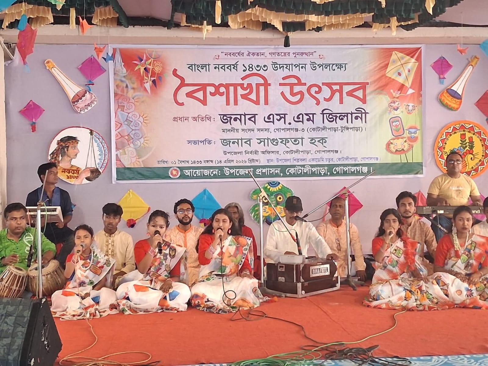 পহেলা বৈশাখ উপলক্ষে আয়োজিত এই অনুষ্ঠানে স্থানীয় শিল্পীদের অংশগ্রহণে এক মনোজ্ঞ সাংস্কৃতিক অনুষ্ঠান পরিবেশিত হয়। 'নববর্ষের ঐক্যতান, গণতন্ত্রের পুনরুত্থান'—এই স্লোগানকে সামনে রেখে শিল্পীরা দেশাত্মবোধক গান ও লোকসংগীত পরিবেশন করেন। ছবিতে দেখা যায়, ঐতিহ্যবাহী পোশাকে সজ্জিত একদল শিল্পী হারমোনিয়াম, তবলা ও অক্টোপ্যাড সহযোগে বৈশাখী সংগীত পরিবেশন করছেন।