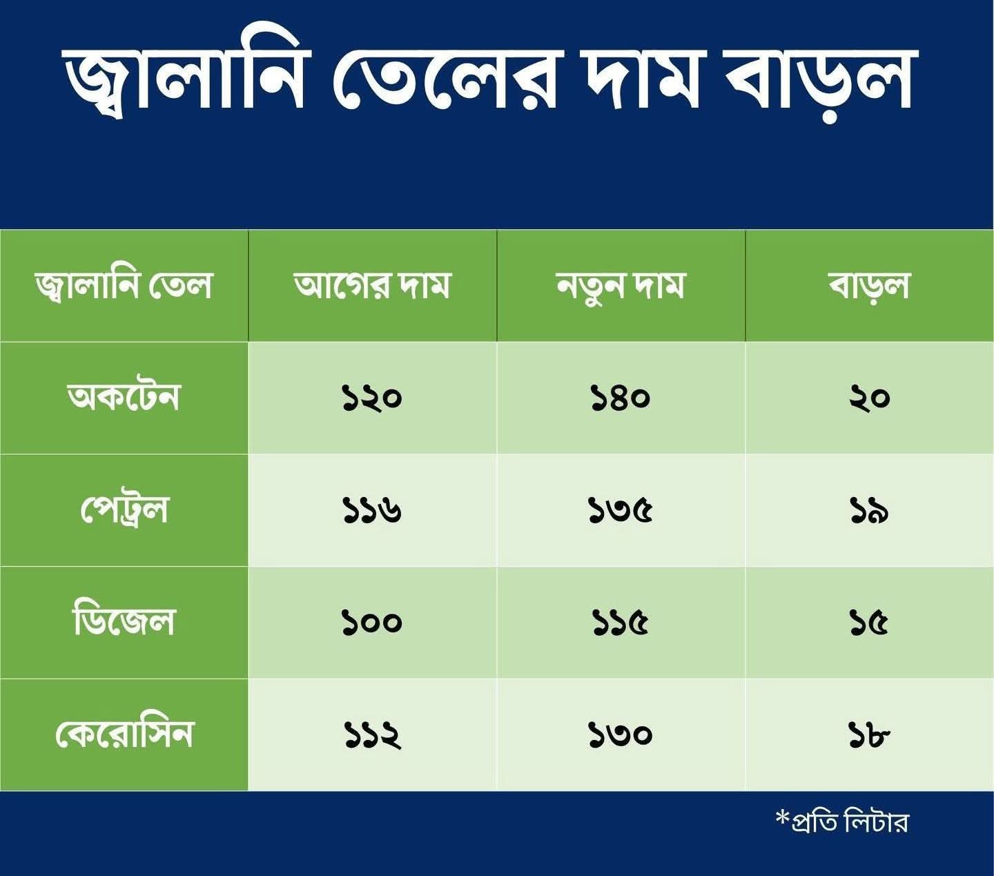 তেলের দাম বৃদ্ধি, আগামী কাল রবিবার থেকে কার্যকর।