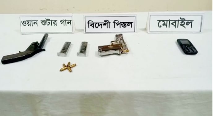 চাঁপাইনবাবগঞ্জে র‌্যাবের হাতে আগ্নেয়াস্ত্রসহ অস্ত্র ব্যবসায়ী আটক     নিজস্ব প্রতিবেদক, চাঁপাইনবাবগঞ্জঃ অস্ত্র চোরাচালানের গোপন সংবাদে অস্ত্র উদ্ধার অভিযান চালিয়ে ১টি ওয়ান শুটার গান, ১টি বিদেশি পিস্তল, ২টি ম্যাগাজিন এবং ৪