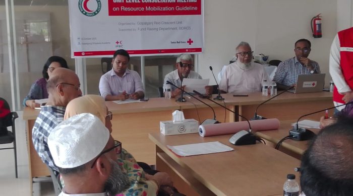 পলাশ সিকদার, গোপালগঞ্জ জেলা প্রতিনিধিঃ গোপালগঞ্জ রেড ক্রিসেন্ট ইউনিট সমর্থিত:রিসোর্স মবিলাইজেশন গাইডলাইন বিষয়ে ইউনিট লেভেল কনসালটেশন সভা অনুষ্ঠিত হয়েছে। আজ সোমবার সকাল ১১ টায় শহরের শেখ মনি অডিটোরিয়াম হল রুমে