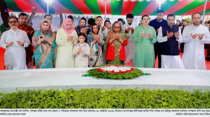 পলাশ সিকদার, গোপালগঞ্জ জেলা প্রতিনিধি: গোপালগঞ্জের টুঙ্গিপাড়ায় নিজ বাড়িতে ব্যক্তিগত সফরে এসে বঙ্গবন্ধুর সমাধিতে শ্রদ্ধা জানিয়েছেন প্রধানমন্ত্রী শেখ হাসিনা।এসময় ছোটবোন শেখ রেহানা তার সঙ্গে ছিলেন। মঙ্গলবার ১০ অক্টোবর বিকাল ৫